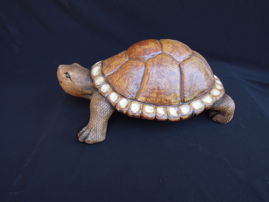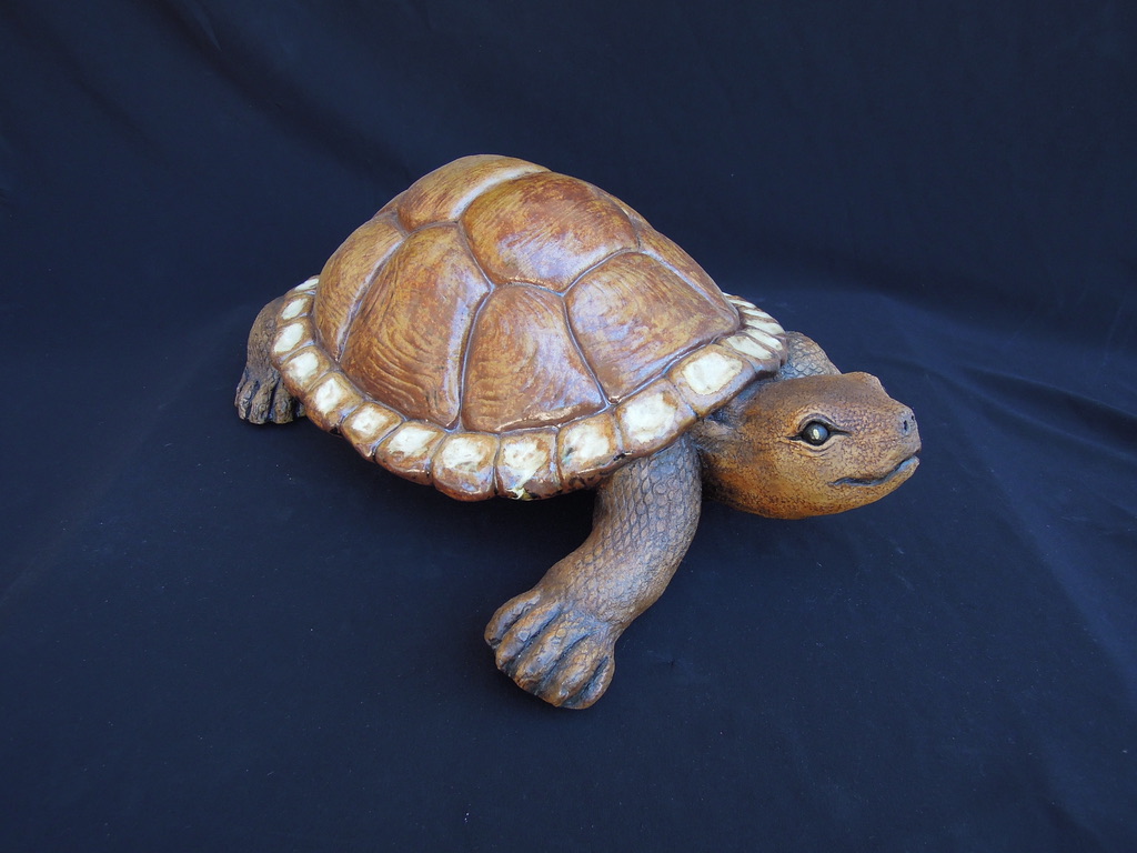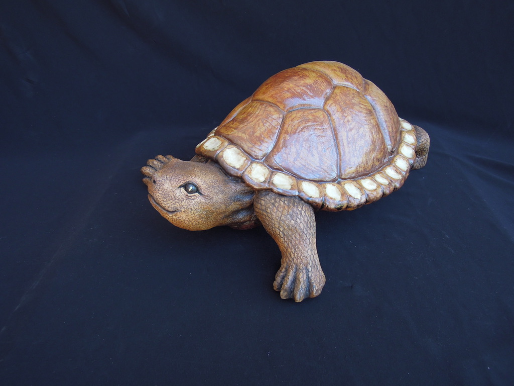 This is is a one of a kind handsculpted turtle that has glass taxidermy eyes that makes eye contact and the gesture of the legs makes it look like its walking towards you. It can be in or outdoors and is water tight and will never fade.